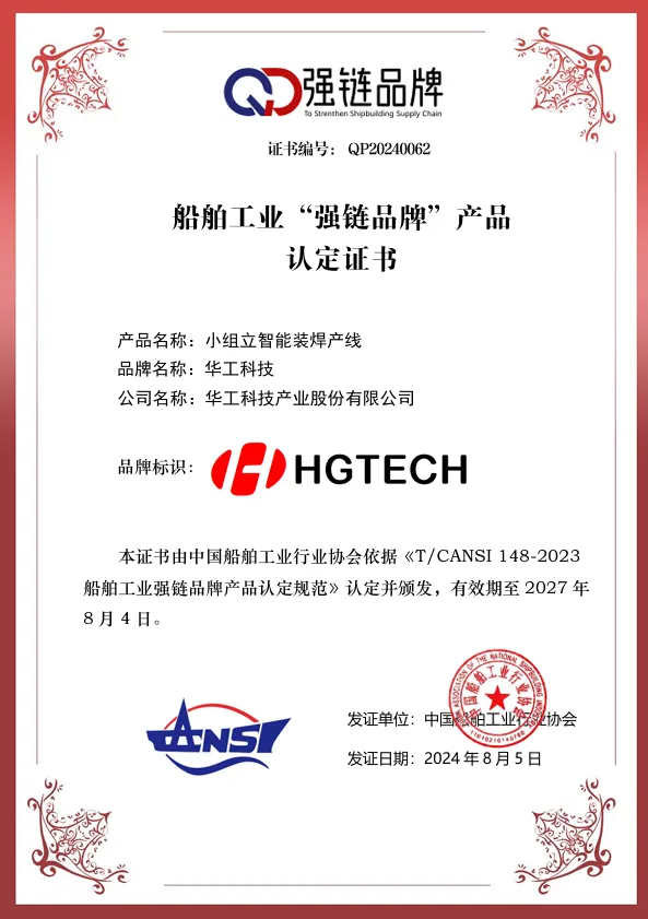 8月8日,中國(guó)船舶工業(yè)行業(yè)協(xié)會(huì)公布2024年度船舶工業(yè)“強(qiáng)鏈品牌”產(chǎn)品認(rèn)定結(jié)果,華工科技申報(bào)的“部件智能切割下料線”和“小組立智能裝焊產(chǎn)線”通過(guò)中國(guó)船舶工業(yè)行業(yè)協(xié)會(huì)的專(zhuān)家團(tuán)隊(duì)審查,被認(rèn)定并列入船舶工業(yè)“強(qiáng)鏈品牌”產(chǎn)品目錄。