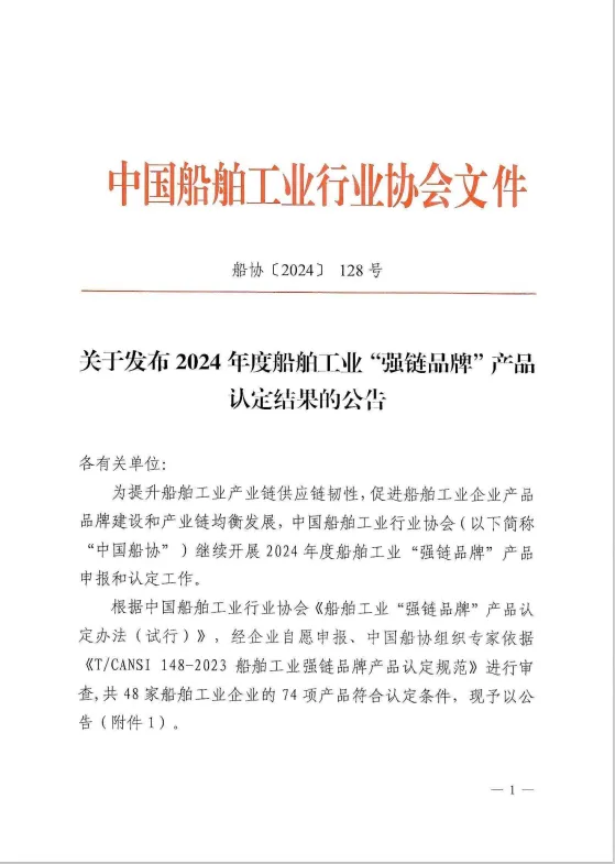 “強(qiáng)鏈品牌產(chǎn)品”是中國(guó)船協(xié)根據(jù)《T/CANSI 148-2023 船舶工業(yè)強(qiáng)鏈品牌產(chǎn)品認(rèn)定規(guī)范》遴選出的對(duì)船舶工業(yè)供應(yīng)鏈具有重要意義的船舶設(shè)備、設(shè)備部件、材料、系統(tǒng)、技術(shù)解決方案、軟件等產(chǎn)品和服務(wù),旨在提升船舶工業(yè)產(chǎn)業(yè)鏈供應(yīng)鏈韌性,促進(jìn)船舶工業(yè)企業(yè)產(chǎn)品品牌建設(shè)和產(chǎn)業(yè)鏈均衡發(fā)展。被認(rèn)定的產(chǎn)品需具有較好的商業(yè)化應(yīng)用業(yè)績(jī),在特定市場(chǎng)占據(jù)一定市場(chǎng)份額,具有核心自主知識(shí)產(chǎn)權(quán)。