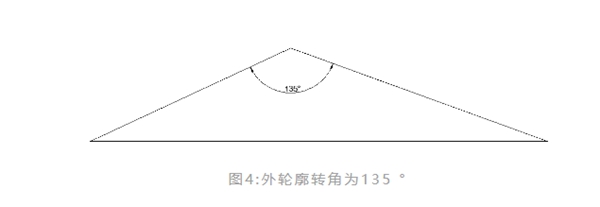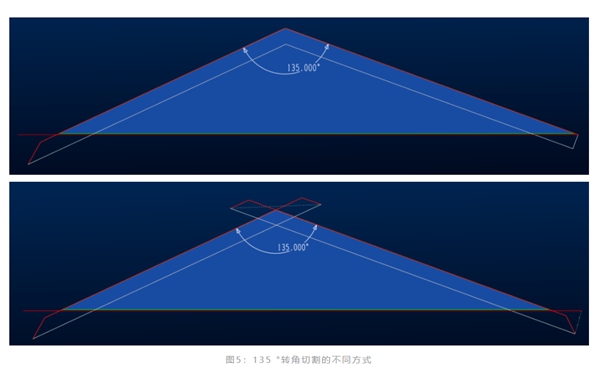 當(dāng)轉(zhuǎn)角是鈍角或是超過一定角度(這個角度在編程軟件里可設(shè)置)的時候,切割頭可以直接通過旋轉(zhuǎn)達到相鄰線段所需角度。如圖4所示,對于135 °的外輪廓,當(dāng)我們在軟件里面設(shè)置好轉(zhuǎn)角回路閾值,在出程序時,就可以決定我們是直接成型,還是重新打孔加引線兩次成型。