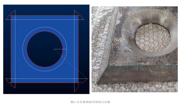 如圖6所示,正方形的4條邊都切割坡口,每條邊都是單獨打孔然后偏轉(zhuǎn)切割頭。通過修改軟件中引線參數(shù),我們可以決定轉(zhuǎn)角過渡時引入線和引出線的長度。這種切割方式的好處是轉(zhuǎn)角處切割質(zhì)量好,相鄰邊切割相互獨立,不會出現(xiàn)轉(zhuǎn)角燒融的現(xiàn)象。從切割樣件圖片可以看到,25mm鐵板四周坡口轉(zhuǎn)角處的切割質(zhì)量良好,沒有出現(xiàn)轉(zhuǎn)角過燒現(xiàn)象。