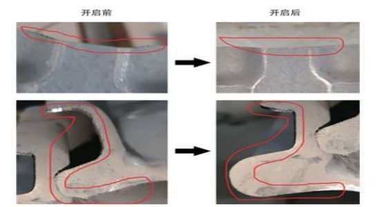 零件實際生產(chǎn)過程中,受熱壓回彈、投料等因素影響,工件存在不同的狀態(tài),數(shù)模編程與實際工件存在一定誤差,是導致拐角(圖8)質(zhì)量較差和燒傷的原因。