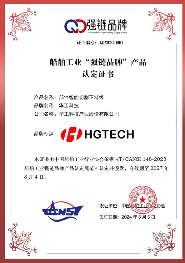 8月8日,中國船舶工業(yè)行業(yè)協(xié)會公布2024年度船舶工業(yè)“強(qiáng)鏈品牌”產(chǎn)品認(rèn)定結(jié)果,華工科技申報(bào)的“部件智能切割下料線”和“小組立智能裝焊產(chǎn)線”通過中國船舶工業(yè)行業(yè)協(xié)會的專家團(tuán)隊(duì)審查,被認(rèn)定并列入船舶工業(yè)“強(qiáng)鏈品牌”產(chǎn)品目錄。