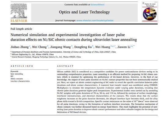近日,華工科技中央研究院與中國(guó)科學(xué)技術(shù)大學(xué)合作開(kāi)展的寬禁帶化合物半導(dǎo)體激光退火研究取得重大進(jìn)展,由中國(guó)科學(xué)技術(shù)大學(xué)李家文教授為通訊作者,華工科技中央研究院半導(dǎo)體項(xiàng)目技術(shù)負(fù)責(zé)人黃偉博士為共同通訊作者所著的論文《Numerical simulation and experimental investigation of laser pulse duration effects on Ni/SiC ohmic contacts during ultraviolet laser annealing》在國(guó)際知名學(xué)術(shù)期刊《Optics and Laser Technology》正式發(fā)表,標(biāo)志著我國(guó)在半導(dǎo)體激光制程領(lǐng)域的基礎(chǔ)研究獲得國(guó)際學(xué)術(shù)界認(rèn)可。